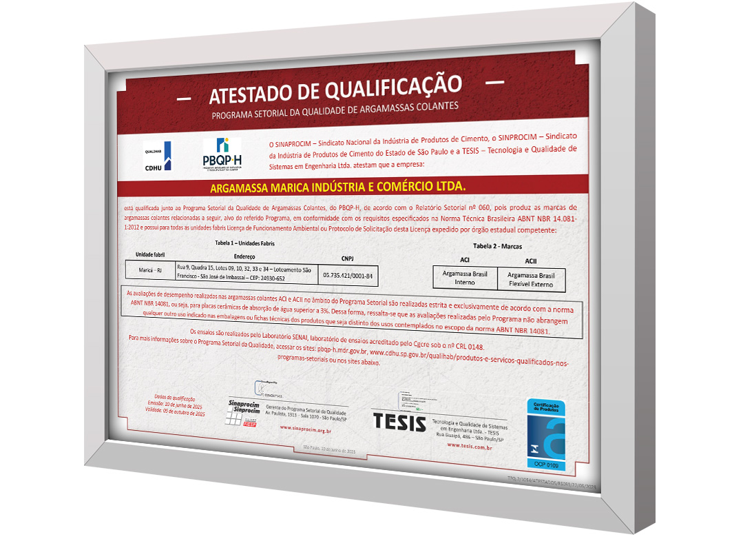 A Argamassa Brasil foi qualificada no Programa Setorial de Qualidade de Argamassas Colantes do PBQP-H, tendo seus produtos em conformidade com a norma ABNT NBR 14.081, sendo atestada pelo SINAPROCIM / SINPROCIM e pela TESIS.